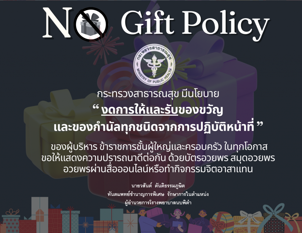 ภาพประชาสัมพันธ์ 19/03/202423/03/2026 NO GIFT POLICY Posted By: IT-Noppitum 0 Comment Facebook iconFacebookLINE iconLine